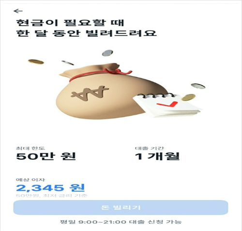 신용점수와 상관없이 토스에서 심사를 해서 복잡한 절차 없이 대출을 할 수 있으며 SC제일은행과 토스가 제휴하여 제공하는 비상금 대출입니다.대출대상 : 만 19세 이상대출금리 : 연 5.63%부터대출한도 : 10만원 ~ 50만원대출기간 : 1개월상환계좌 : SC제일은행 계좌필요상환방법 : 원리금균등분할상환수수료 : 취급 수수료 없음 중도 상환 수수료 없음연체금리 : 대출금리 + 연체가산금리(연3%)토스 비상금빌리기 신청방법