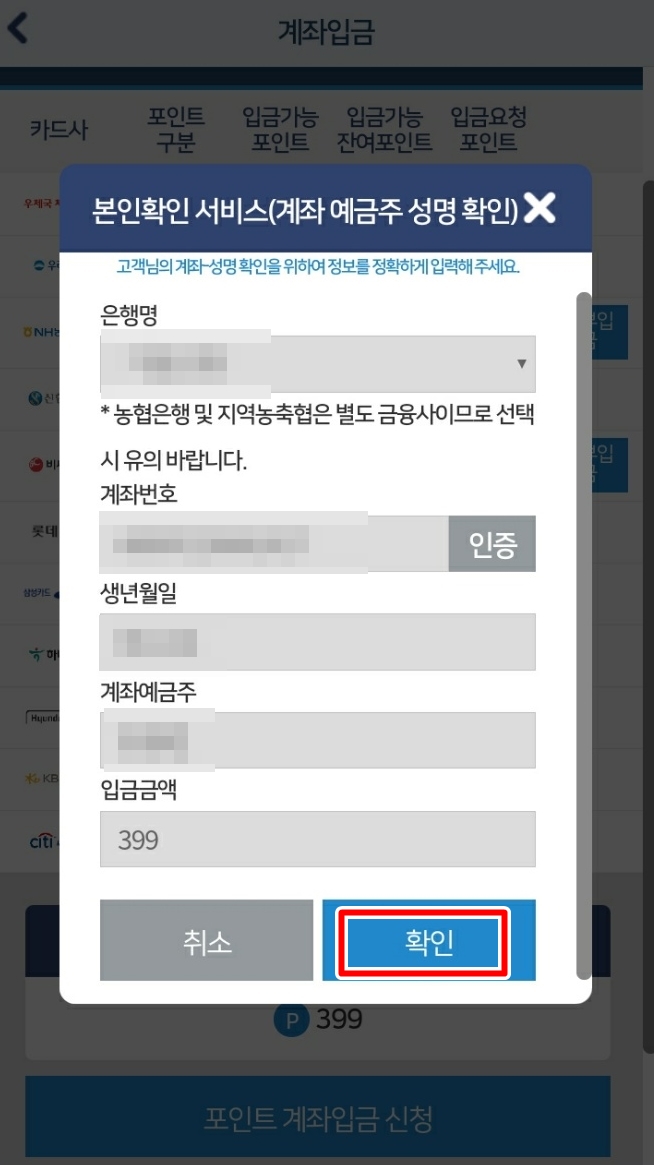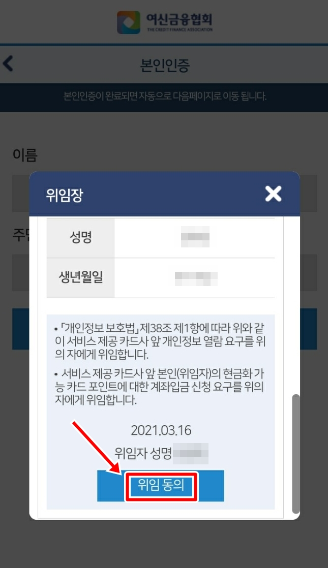 신용카드 포인트 현금교환 개인정보 보호법에 의해서 위임동의를 해야하며 이름과 주민등록번호를 입력을 하시고 "조회"버튼을 눌러주시기 바랍니다.
