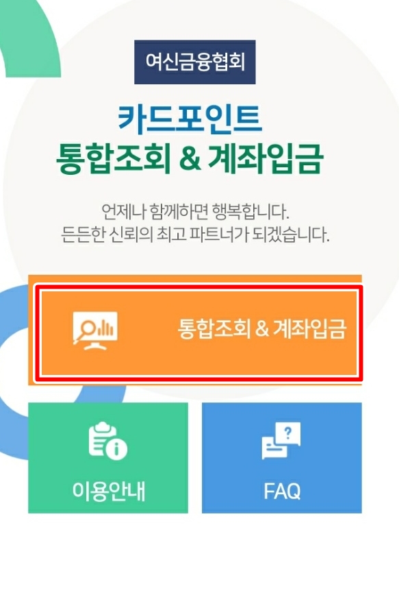 신용카드 포인트 현금교환 앱에 접속을 해주셔서 "통합조회 & 계좌입금"을 선택을 해주시기 바랍니다.
