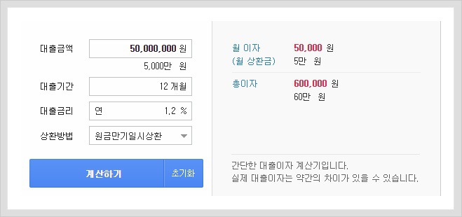대출금리는 연 1.2%로 만기까지 고정금리이며, 현재 금리로 대출이자를 계산을 할 시 5,000만 원을 대출받을 경우 고정금리 연 1.2%이므로 월 5만 원 x 12개월 = 60만 원의 비용의 이자가 발생을 하게 됩니다.